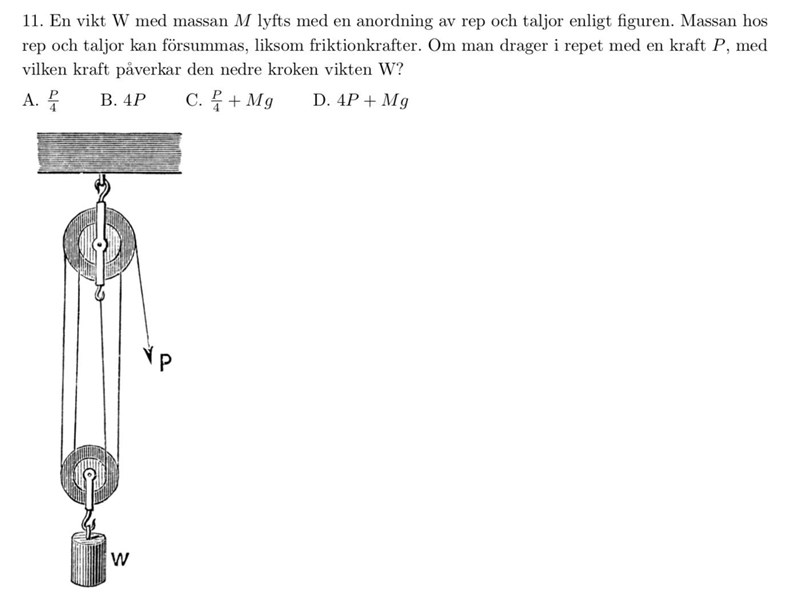 Alternativen där Mg ingår verkar orimliga då det skulle innebära att oavsett hur löst man drager i repet kommer ändå den nedre kroken påverka vikten med kraften Mg. Sedan uteslöt jag alternativ A genom att resonera att det vore en ovärd anordning om man påverkade vikten med mindre kraft än man drager i repet.