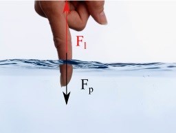 Lyftkraften FlF_l måste vara exakt lika med tryckkraften FpF_p. Du vet också att lyftkraften på ett föremål nedsänkt i vatten ges av Arkimedes princip, tyngden av den undanträngda (deplacerade) vätskan. När en kropp påverkar en annan kropp med en kraft, så blir den själv påverkad, med en lika stor kraft, i motsatt riktning (Newtons tredje lag). Det innebär att vågen i sin tur påverkas av en extra kraft Fp=FlF_p=F_l när du trycker ned ditt finger med kraften Fl=FpF_l=F_p.