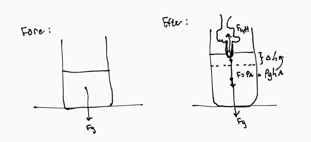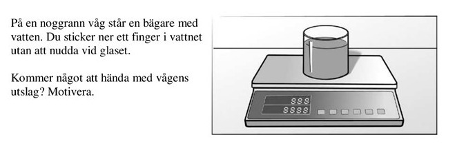 Förlåt jag förstår inte vad ni försöker komma fram till, i facit skrivs det att När fingret sticks ner kommer vatten motsvarande fingrets volym att trängas undan. Vågens utslag kommer att öka motsvarande massan av den undanträngda vattenvolymen.