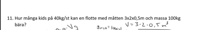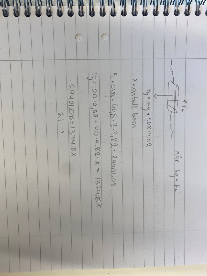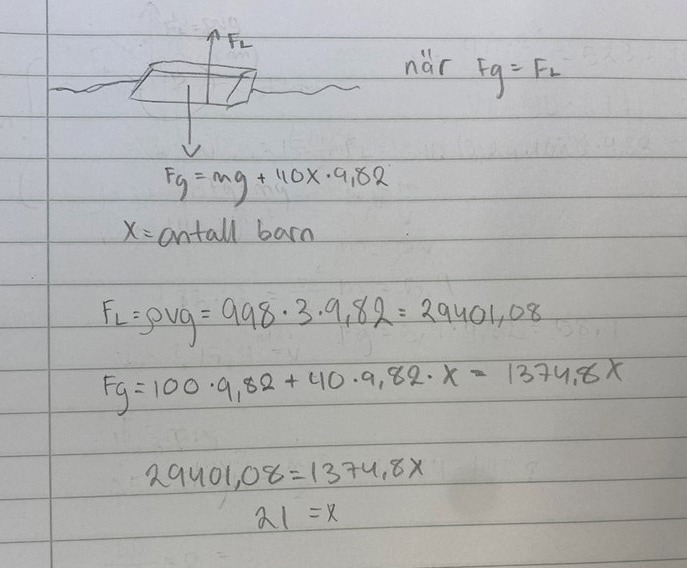 Hej! tack för ditt svar, men jag förstår fortfarande inte varför jag får fel. Jag tänker att det inte borde vara svårare än att tänka att för att något ska kunna flyta måste tyngdkraften vara lika med lyftkraften. Sedan ställer jag upp en ekvation där jag sätter Fg= Foch med x på ena sidan som är antalet barn.