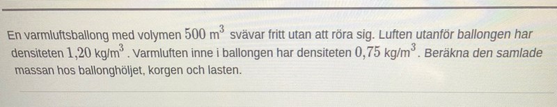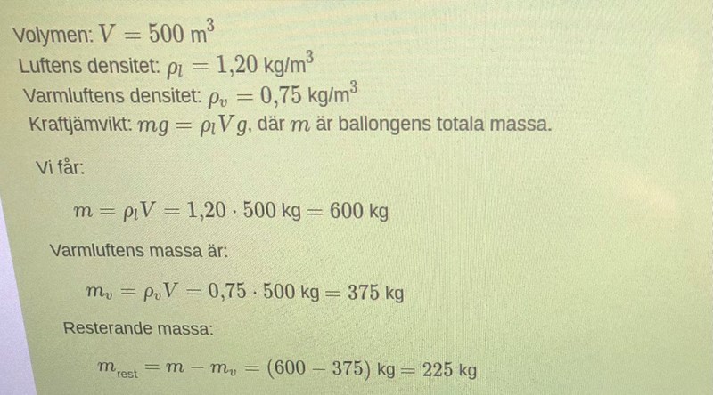 Lyftkraften är lika med tyngdkraften på (ballongen + varmluften). Man vill beräkna ballongens massa. Man kan beräkna lyftkraften och varmluftens massa. Man har valt att räkna ut massan för (ballongen + varmluften) eftersom det är lätt att beräkna, och varmluftens massa, som också är lätt att beräkna. Då kan man få fram massan för ballongen genom att beräkna massan för (ballongen plus varmluften) minus massan för varmluften.