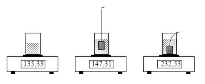 "På en våg står en bägare med vatten, och vågen visar 135,33 g. Ett metallstycke sänks ner i vattnet så att metallstycket varken rör vid bägarens väggar eller botten. Vågen visar då 147,31 g. När metallstycket sedan släpps, så att det vilar på bägarens botten visar vågen i stället 232,53 g.