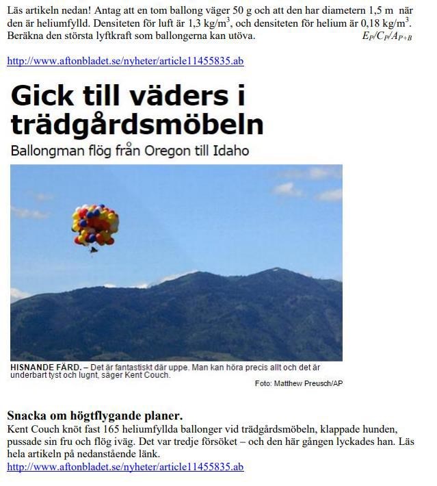 Antag att en tom ballong väger 50 g och att den har diametern 1,5 m när den är heliumfylld. Densiteten för luft är 1,3 kg/m3 och densiteten för helium är 0,18 kg/m3.