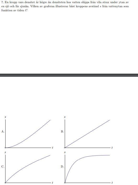 Jag vet inte om jag har rätt men jag tänkte att lyftkraften beror på hur stor del volym undanträngd vätska det är. Då borde väl lyftkraften först vara liten och sen bli större? Eftersom Fres = mg - lyftkraft tänkte jag att föremålet först har större kraft neråt för att den sedan ska avta och nå en maximum värde. Är det rätt tänkt och varför blir svaret A)
