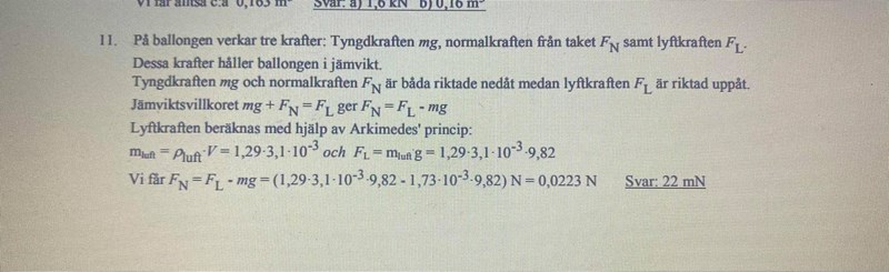 Laguna skrev:Det finns bara en lyftkraft, och den kommer av differensen mellan ballongens densitet och den omgivande luftens densitet. Ser lösningen till den andra uppgiften inte ut att göra så?