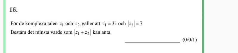 D4NIEL skrev:Eftersom du påbörjat en algebraisk lösning kan vi fortsätta på den, men när du är klar kan du också fundera över att betyder alla tal på avståndet från origo i det komplexa talplanet, dvs alla tal på en cirkel med radien runt origo. Talet är lätt att markera i en sådan graf. Hursomhelst, för att fortsätta på din påbörjade ansats: