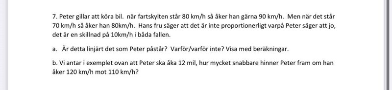 b-uppgiten: Beräkna hur lång tid det tar för Peter att köra 12 mil i de båda fallen och beräkna tidsskillnaden. Du kan här använda formeln s = v•t, där s är tillryggalagd sträcka, t är förbrukad tid och v är medelhastighet.