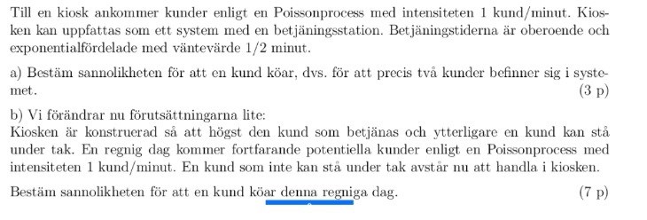 Uppgift b) är ingen M/M/1-process eftersom maximal kölängd är ändlig.