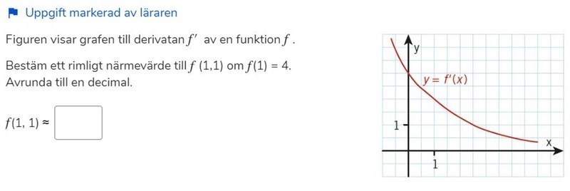 f(1) = 4f'(1) = 2 (avläses i grafen)f(a+h) - f(a)h f'(a)f(1,1) - f(1)0,1 f'(1)f'(1,1)  0,1 · f'(1) + f(1)=0,1 · 2 + 4 = 4,2