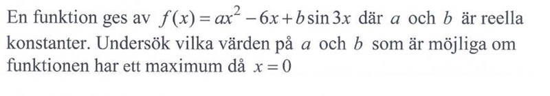 cjan1122 skrev:För maximum vid x=0 krävs att f'(0)=0 och f''(0)<0. Testa att derivera funktionen två gånger och använd dessa vilkor. Vad får du för ekvationer?