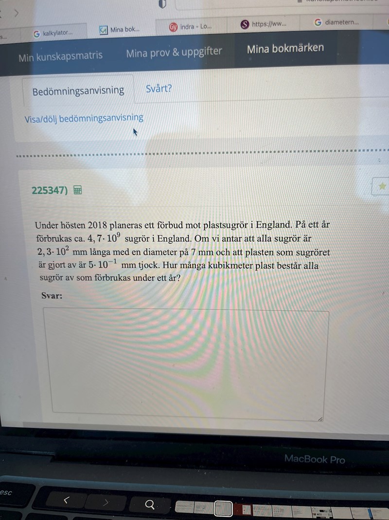 Rita ett stort grovt sugrör med tjock vägg och fundera på hur du skall beräkna volymen plast i röret. Återkom med en snygg ritning så diskuterar vi vidare!