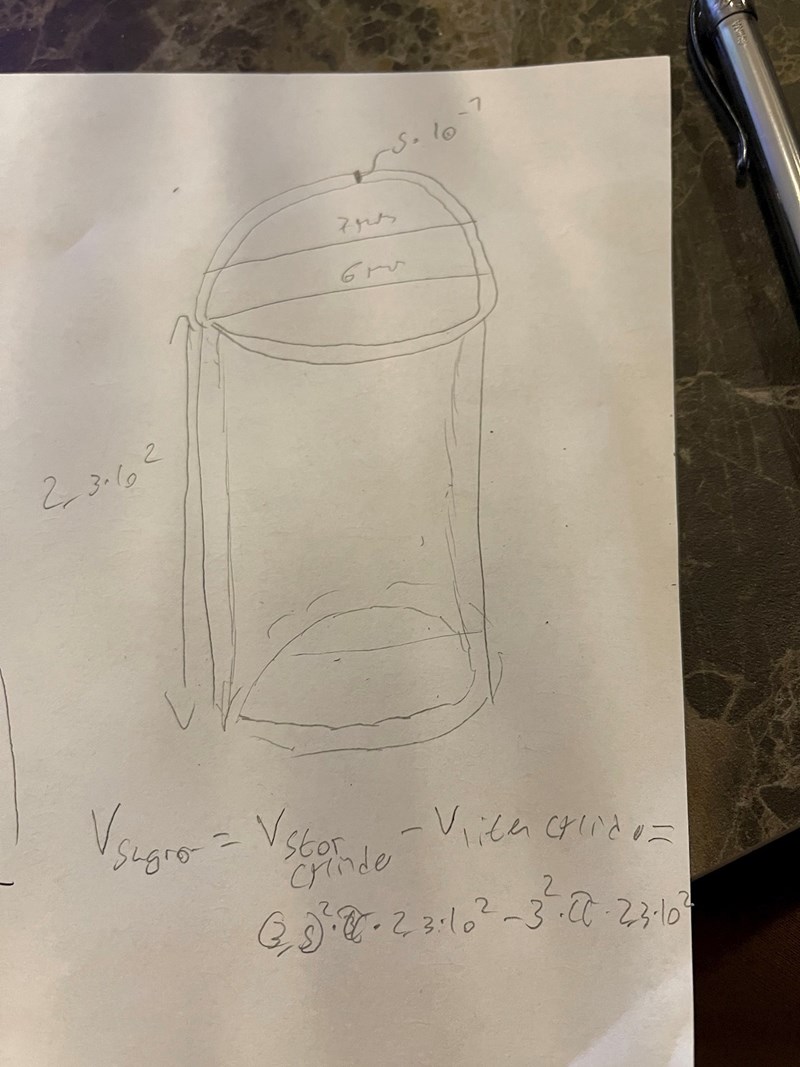 jag tänker att man får ett sugrörs volym genom att beräkna volymen av hela den stora cylindern (alltså  inklusive plastdelen) och sen subtrahera med den mindre cylindern, alltså tomrummet mellan, utan plastdelen.