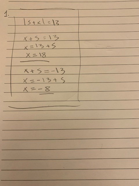 Från -5 går vi 13 steg åt ena eller andra hållet.Därav två ekvationer när man tar bort absoluttecknet.