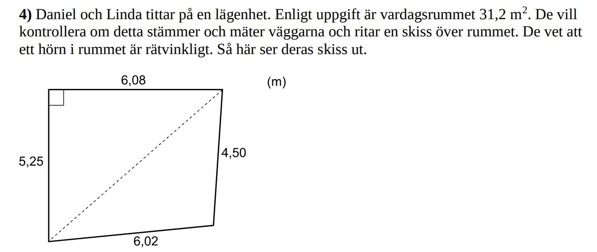 AB=6.08 m ,  AD=5.25m , BC=4.5 m , CD=6.02......Låt A1 vara arean av triangeln ABC...Sedan, A1 = 12 (AB)(AD)...SKA sätta.. AB=6.08 och AD= 5.25 i formeln ovan...A1 =12(6.08)(5.25)      = 15.96 m2Ska använda Pythagoras Sats för att hitta diagonalen BD....BD =(6.08)²+ (5.25)²        =36.97 + 27.56        8.03A2 är arean av triangeln BCD med måttet på sidorna som BC = 4.5m,CD = 6.02m och BD = 8.03m.....Svar på halvomkretsen av triangeln BCD....Nu ska jag hitta S....S = 4.50 + 6.02 ++ 8.032    = 9.28Nu ska jag beräkna med Hernos - Formeln för att hitta området A2 av triangeln BCD.....A2 = 9.28(9.28-4.50)(9.28-6.02)(9.28-8.59)      = 9.28(4.78 ×3.26 × 0.69)      =99.78      = 9.99Området i vardagsrummet är A1+A2A1+ A2 = 9.99 + 15.96                 25.95Därför är den faktiska ytan av vardagsrummet enligt skissen ungefärlika med 25.95m²......