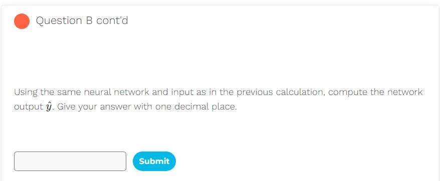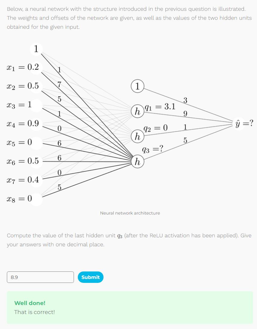 Du gör på samma sätt som du gjorde på första uppgiften, men använder värdena på q istället för x. Alltså, multiplicerar varje värde på q med motsvarande vikt, summerar och adderar bias-termen.