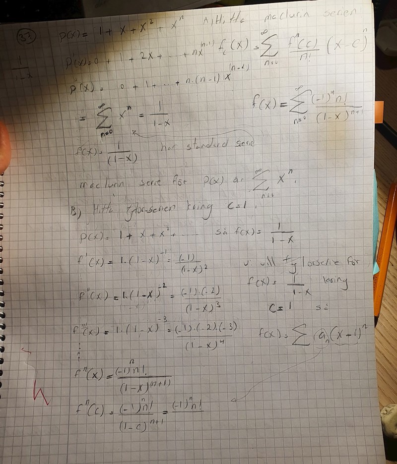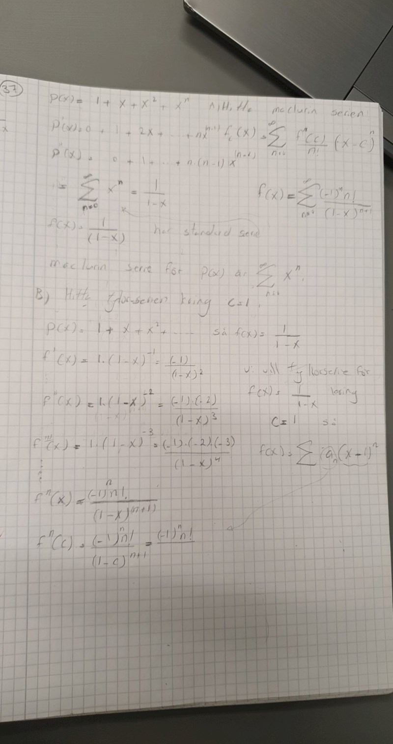 Finna flera olika formler så jag blir förvirrad. Såg att serien är 1+ x+ x^2 + x^3 och trodde att funktionen till serien ska vara 1/1+x . Därför deriverade jag det för att få fram ett mönster för hur den n:te drivatan i punkten c är. Alltså . Men jag får det till noll när jag stoppar in c=1