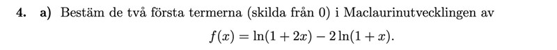Jag delade upp funktionen f(x) i g(x)-2h(x) och räknade ut de separata maclaurinserierna med hjälp av formelbladet, men det som gör mig fundersam är formuleringen de två första termerna skilda från 0.