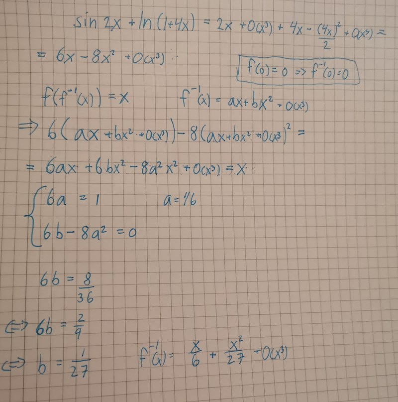 När jag gör som jag funderade på ovan så får jag först f(x) = 6x - 8x2 + o(x3). Med ansatsen f-1(y) = a + bx + cx2 får jag sedan f-1(y) = y/6 + y2/27 + o(y3).