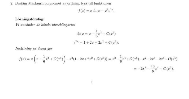 Jag la in en bild på min uträkning nu i frågan. Vad jag förstår det som så är Maclaurin utveckling att man ska approximera i punkten 0?