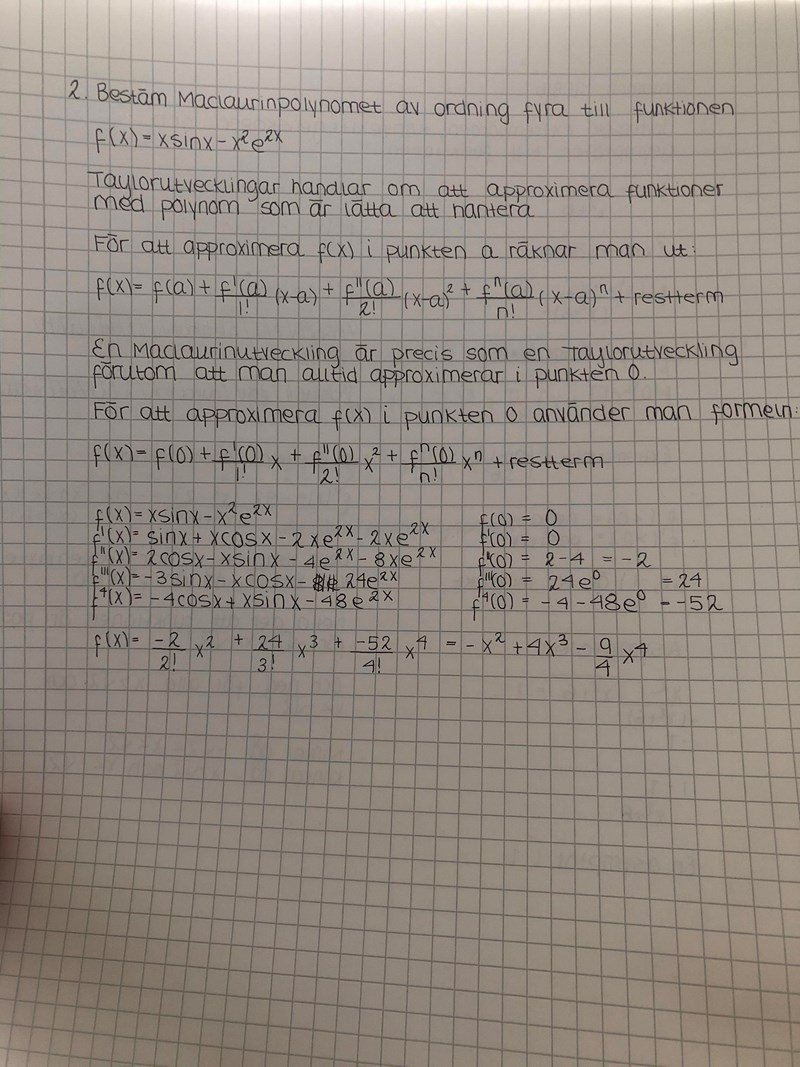 Hej, jag ska bestämma Maclaurinpolynomet av ordning fyra till f(x)=xsinx-x2e2x och jag gjorde detta genom att ta fram f(0), f'(0), f''(0), f'''(0) och f(4)(0) och satte sedan in detta i formeln för Maclaurinutveckling.