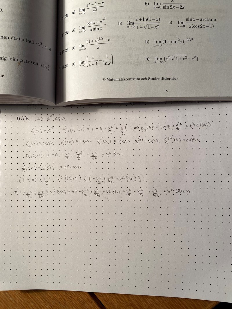 Hej, jag ska hitta Maclaurinutveckligen av ordning 4 av och har delat upp produkten i två faktorer. På slutet, det vill säga när jag ska multiplicera ihop funktionerna får jag en produkt som inte är så tacksam att jobba med. Vet någon om det finns ett enkelt sätt att multiplicera ihop funktionerna? Jag infogar en bild nedan på hur det ser ut just nu. Tack på förhand