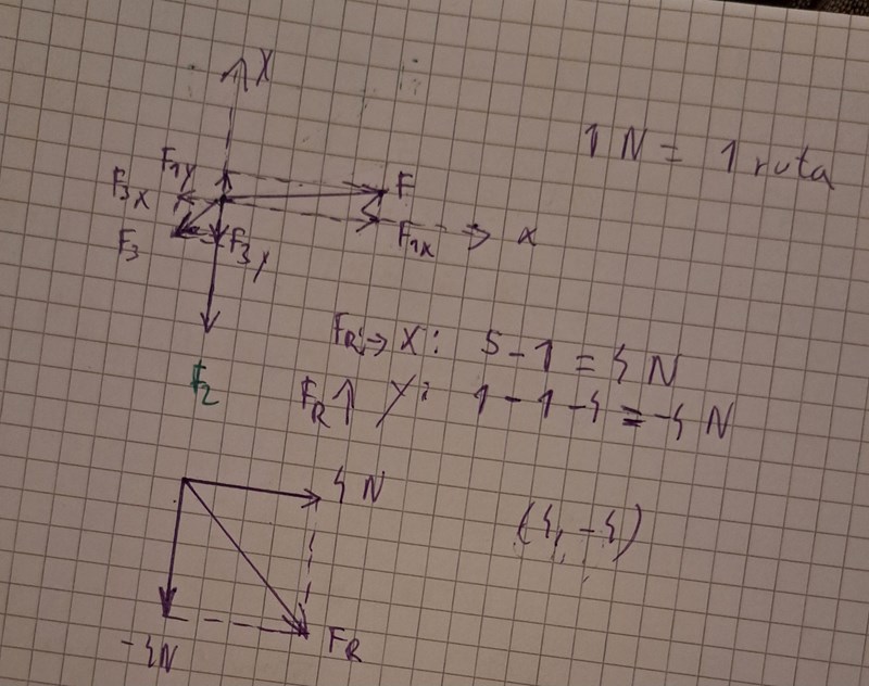 En kraft som är 3N åt höger och 2 N neråt skulle vara i jämvikt med en annan kraft som var 3 N åt vänster och 2 N uppåt.