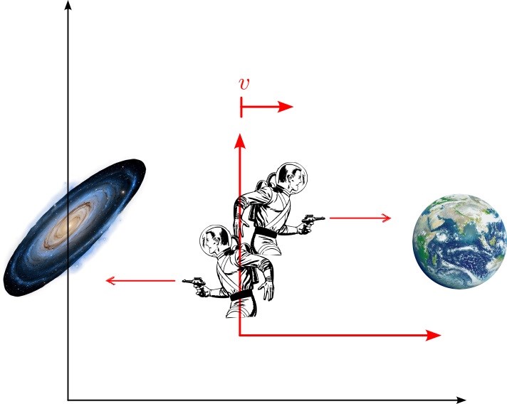 Tänk dig att två astronauter, som rör sig med en väldigt hög hastighet från Andromeda till jorden, står rygg mot rygg i sitt rymdskepp. De befinner sig precis mitt emellan Andromeda och jorden. Samtidigt avlossar de sina två laserpistoler, en framåt och en bakåt.