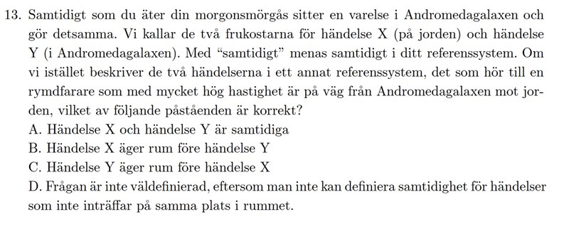 Vi bestämmer två händelser: händelse X (när ljusstråle a träffar rymdfararen ) och händelse Y (när ljusstråle b träffar rymdfararen). Om vi beskriver de två händelserna i ett annat referenssystem, det som hör till rymdfararen vilket av följande påståenden är korrekt?