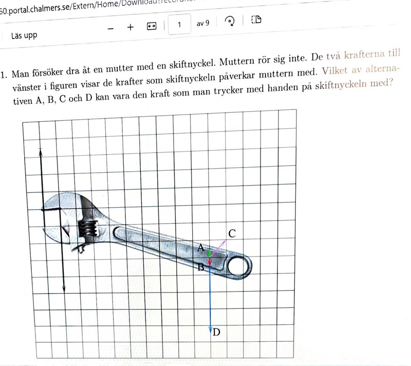 Jaha kanske är det jag som såg den som 0.25 där det slutar..alltså pilspetsen. Isåfall blir kraftresultanten 0.75 N med B eller  4.25 N med kraften från D. Så det måste vara B som bidrar med att skiftnyckeln ska bli 0.