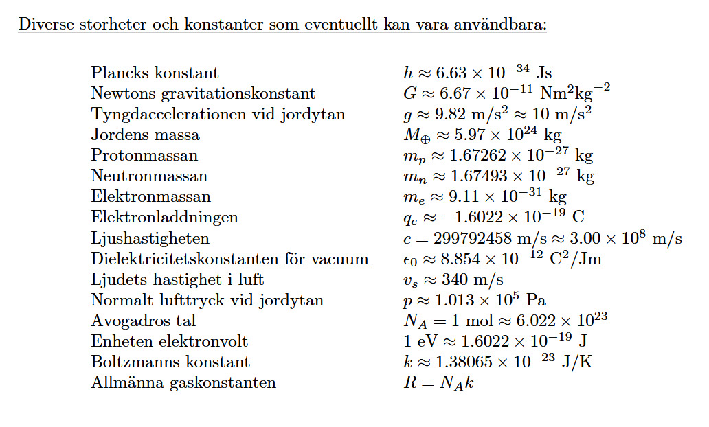 Tack för tipset. Jag vet att det är kända för att vara strikta på Mafy provet så jag vet inte i fall man hade fått rätt eller inte. Antagligen rätt eftersom att 91kPa är ett noggrannare svar men om man räknar som du säger med 9.8m/s^2 så får man 9.15*10^4 Pa vilket man kan avrunda till 9.2kPa. Med tanke på att de ger provtagarna konstanter att räkna med i provet så borde ju rätt svar vara de svar där man använder deras konstanter och svarar med lika många värdesiffror som ges i uppgiften(2 värde siffror). De skriver själva att normalt lufttryck vid jordytan är 1,013 * 10^5 Pa och tyngdacceleration vid jordytan är 9.82 m/s^2 eller 10 m/s^2. Med deras konstanter så borde svaret bli (med två värdesiffror) 91kPa. Här är en bild på hur det ser ut på provet: