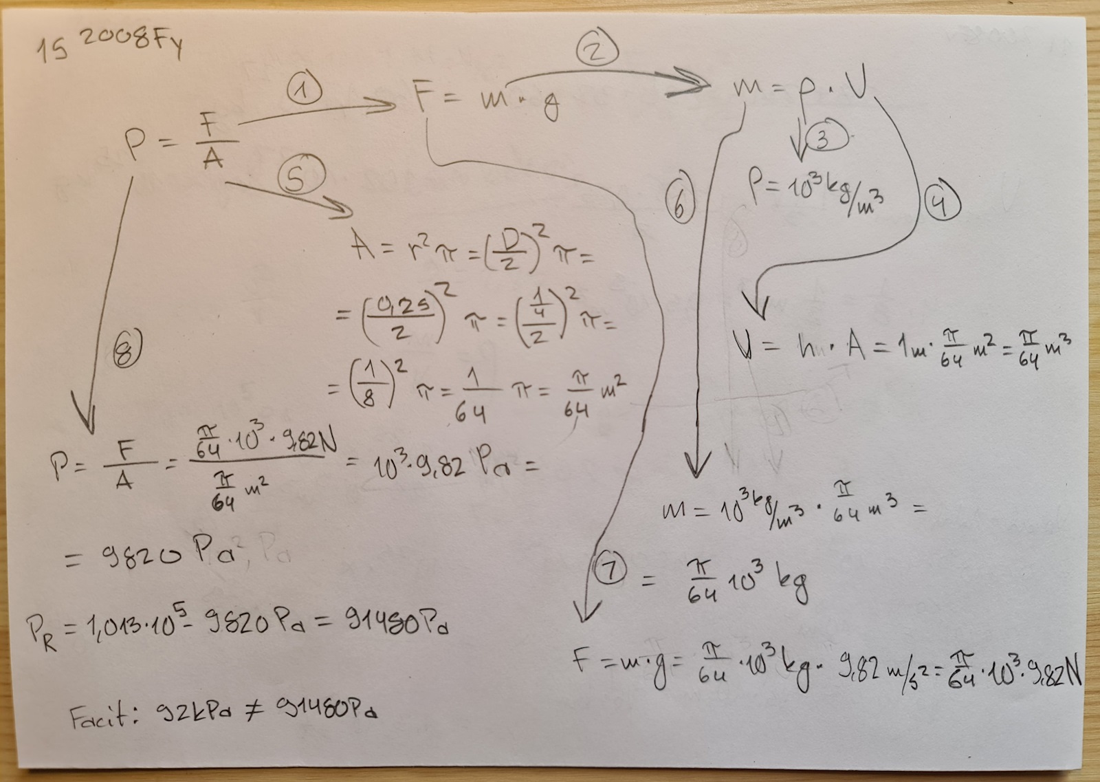 Man har två timmar på fysik delen så om man delar ut de på 30 poäng så får man 4 min per poäng och eftersom det här är en 2p fråga så har man 8 min på sig. Jag skrev ut det så att det skulle gå att läsa men om man bara räknar snabbt så går det mycket fortare. Men fortast som du säger är om man vet att ett atmosfärstryck är lika med 10m hög vatten-pelare. Ska komma ihåg det till nästa uppgift.