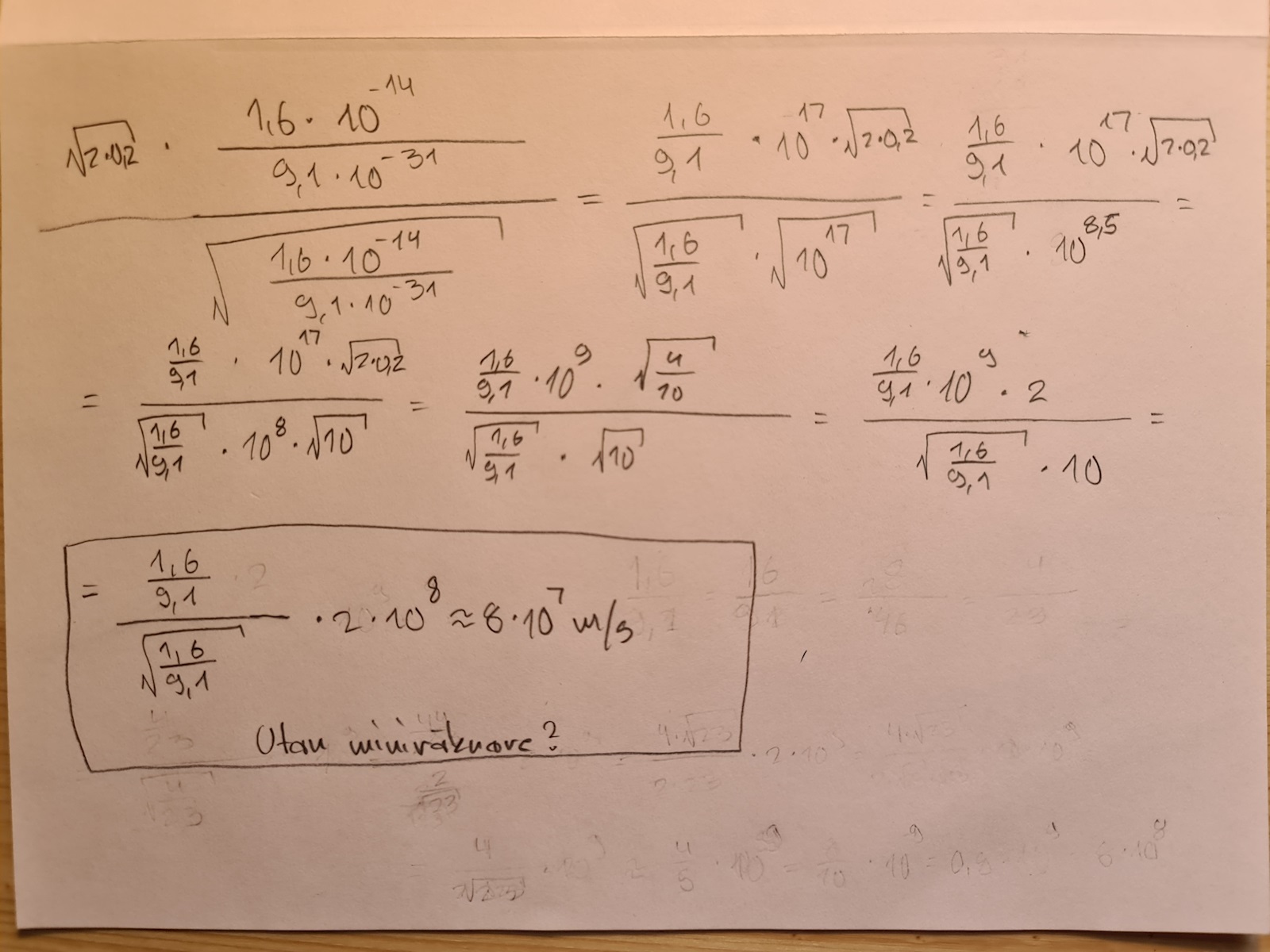 Svaret vet jag ska bli(enligt facit) 8*10^7 m/s men jag har svårt att se hur man kan komma fram till en ett svar utan miniräknare. Men som sagt om ni kan ett knep så dela gärna med er. Tack i förhand!