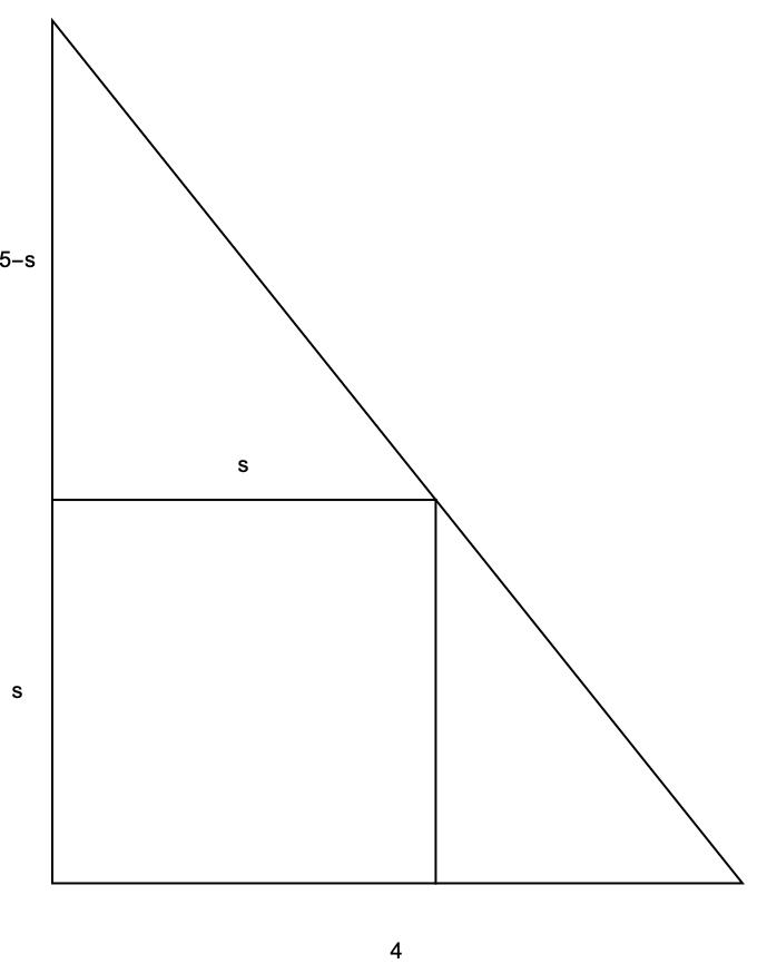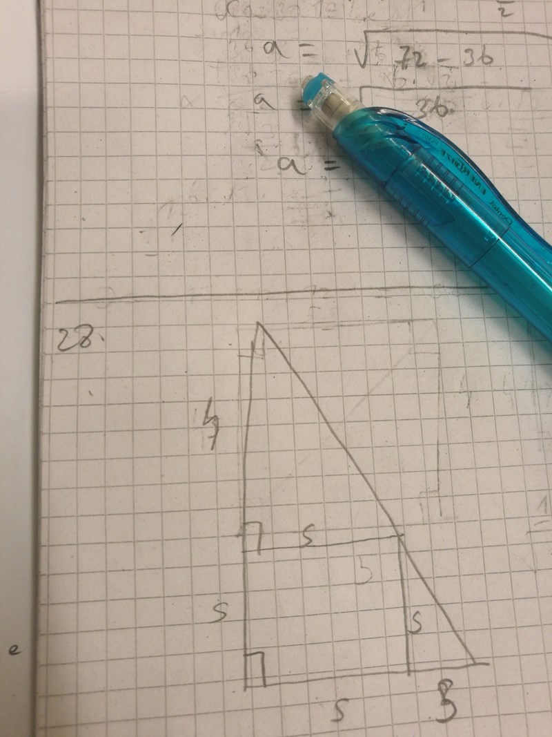 Jag kallar kvadratens sidor för s eftersom de är lika långa. Försökte lösa uppgiften med likformighet, men jag får typ fel