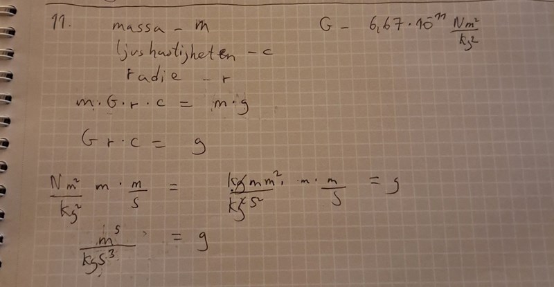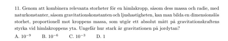 m_himlakropp*r*G*c=k*M_kropp där k är den sökta dimensionslös storhet. Jag vet ej om man förväntas förkorta bort alla enheter och sen komma fram till någon av dessa tiopotenser.