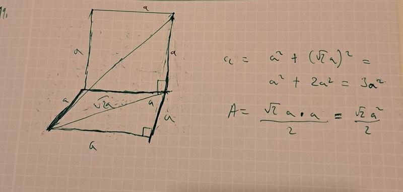 Jag googlade på en sidoyta i en kub och förstod var den ligger. Men däremot har jag ingen aning om hur ska man hitta arean. Bottenarean får jag till A=a^2 men det kan ej vara rätt?