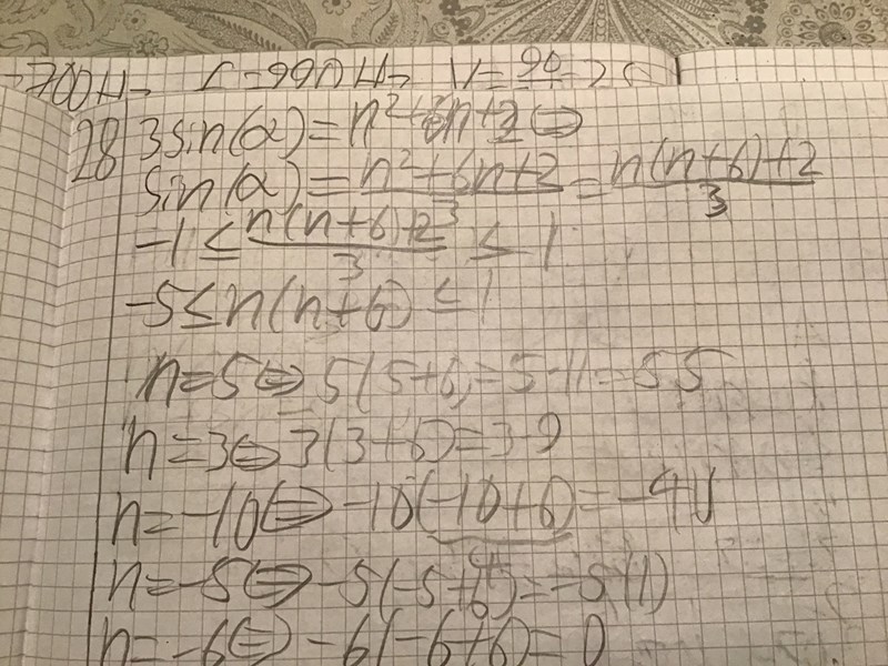Vi har 3sin(a)=n^2+6n+2, flytta över trean til HL så får du sin(a)=(n^2+6n+2)/3, sedan kan högerled ha ett värde mellan -1 och 1, det get -1<=(n^2+6n+2)/3<=1 vi skriver om detta för att förenkla eventuell prövning: