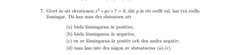 Finns det snabba sätt man kan lösa såna på? Jag tänker två reella lösningar kan betyda att lösningarna är antingen positiva eller negativa. Jag tror ej på c) eftersom den är bara sant om uppgiften skulle tala om för oss att vi har två olika reella lösningar. Men samtidigt säger ej frågan att två reella lösningar ej får ha olika tecken.