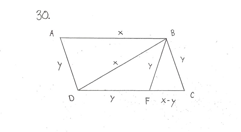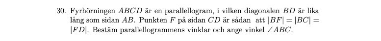 Rita en parallellogram ungefär så här: /___/ fast med ett streck på översidan också. Kalla de båda övre hörnen A och B och de båda nedre D och C. Diagonalen BD skall vara lika lång som sidan AB (och alltså lika lång som sidan CD). Det stämmer inte med min bild - BD måste vara den korta diagonalen, inte den längsta, så jag gör en ny bild så här: \___\ stämmer bättre. Det gör att vi har två likbenta trianglar, ABD och CDB. Markera att dessa tre sidor är lika. Markera också att sidan AD är lika lång som sidan BC. Sedan har vi punkten F på sidan CD - markera att sträckorna BC, BF och DF är lika. Lägg upp bilden här.