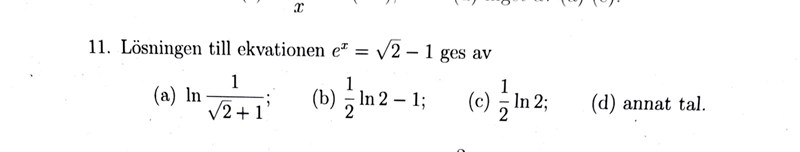 Varför är a) rätt? Jag testade att likställa alla alternativen med lösningen på x. Jag förstår dock inte varför a) stämmer om man enbart förlänger sqrt(2)-1 med dess konjugat och sen hittar lösningen för x eftersom man förlänger väl med dess konjugat om uttrycket skulle ha något rottecken i nämnaren? Jag tycker ej det är något fel med att svara med ln(sqrt(2)-1) . Men det känns som att facit resonerar på annat sätt .