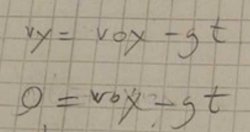 - En ekvation som beskriver att den vertikala hastigheten vy då är 0. Det ger dig ett samband mellan t1, g och v0y.