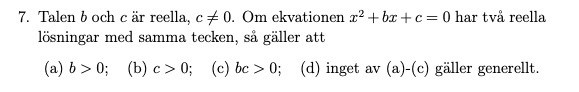 Detta åstadkoms om c > 0 eftersom hela uttrycket i roten blir mindre än b2, vilket betyder att hela rotuttrycket blir mindre än b. Detta är logiskt, och svaret är rätt i facit. Men jag har en fråga: