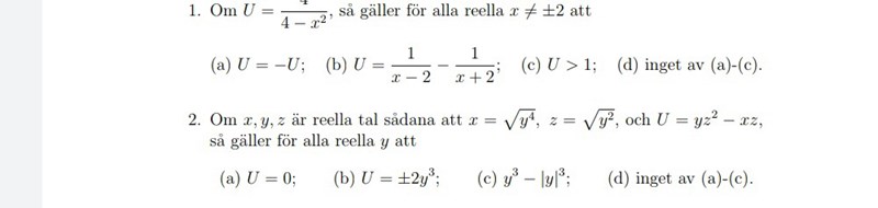 Yngve skrev:Mahiya99 skrev:Vilket likhet syftar du på och när jag ska pröva med tex de där värden du har exempel på, ska jag pröva om det gäller i ekvationen eller alternativen?