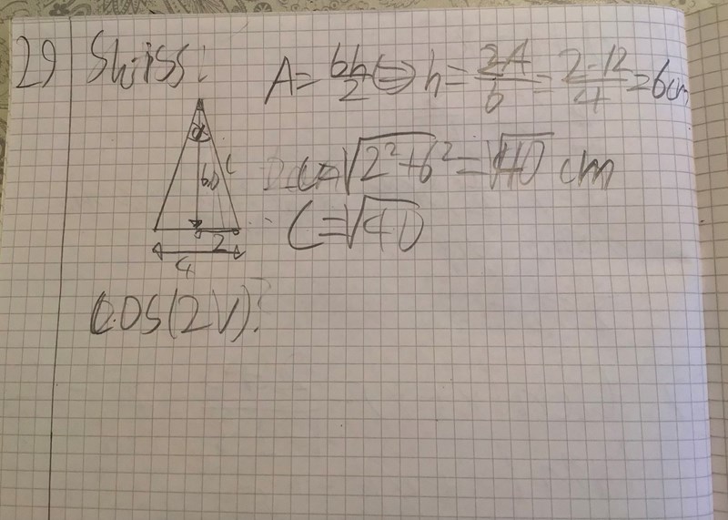 När du vet bas och höjd kan du beräkna längden på de två lika sidorna med Pytagoras, tänk på att bara ta halva basen (du har använt 6 cm ska alltså vara 3) så sidan blir 5.