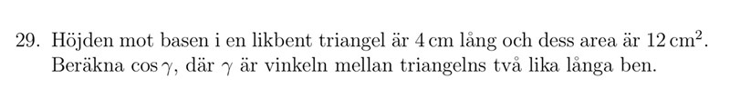 Hejsan, jag har fastnat lite på den här uppgiften. Jag ansatte att man på något sätt skulle tillämpa en trigonometrisk identitet (exempelvis den för halva eller dubbla vinkeln), jag bestämde höjden ur arean, men har inte lyckats komma mycket längre än det. Hur borde man gå till väga för att lösa uppgiften? Tack på förhand!