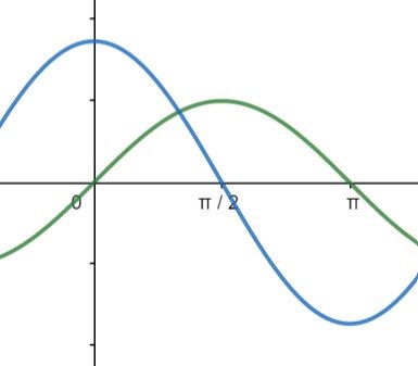 Om du kollar på kurvorna syns det rätt tydligt att summan blir 1 när x=π/2