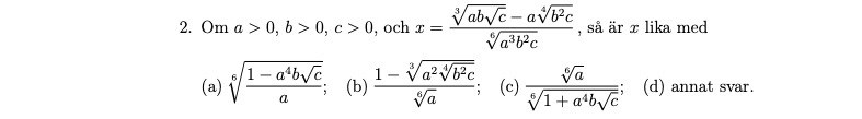 Hej! Skulle behöva hjälp med denna. Jag har skrivit om a, b och c till potensform, men vet inte har jag ska göra för att förenkla x till ett av alternativen nedan. Rätt svar är B.