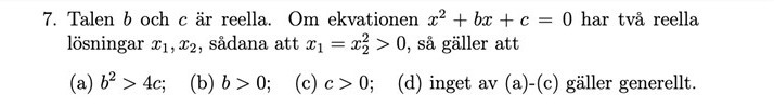När man gör PQ - formen, måste diskriminanten vara större än noll eftersom den har två reella lösningar, därmed tycker jag att svar a är rätt. Men rätt svar är d, varför då?