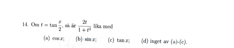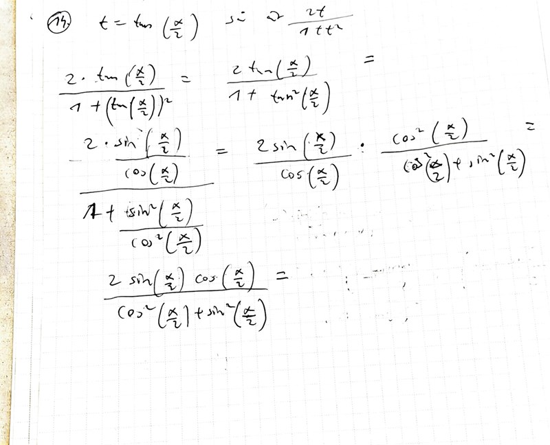 Jag gjorde bytet en gång ja. V=x/2 2sinvcosv/cos^2v+sin^2v =2sin^2vcos^2v=sin(2v)=sin(2*x/2)=sinx