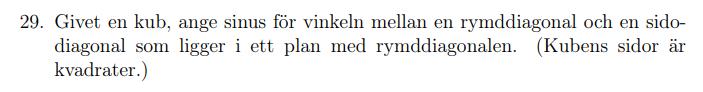 En alternativ lösnings metod är att skriva diagonalerna som vektorer t.ex och sedan använda skalär produkt . Sedan är det bara att lösa för cosinus och omvandla till sinus med hjälp av trignometriska ettan.