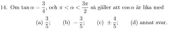 vi har en 3,4,5 triangel men tan(x) är positiv i 3dje kvadrant eftersom sin(x) och cos(x) båda är negativa, det enda valet är B eller D men cos(x) (given från tan(x)) get att cosinus måste vara -4/5 så är svaret alltså d.